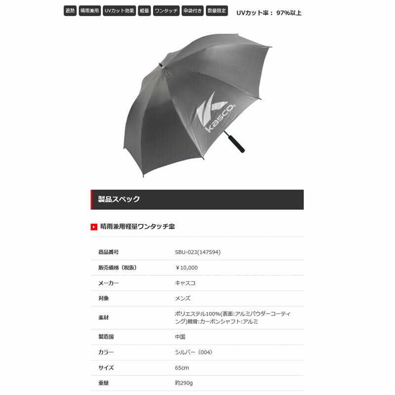 晴雨兼用軽量ワンタッチ傘 black 黒(ブラック) 素材 :ポリエステル100%(表面:アルミパウダーコーティング)親骨:カーボンシャフ卜:アルミ サイズ:65cm 重量 :約290g Japanese TOKYO golf shop machino golf yasan.晴雨兼用軽量ワンタッチ傘 キャスコ アンブレラ ゴルフ用 晴雨兼用軽量ワンタッチ傘 2019年モデル 黒 ブラック kasco umbrella black 19wn ◆在庫につきまして◆ こちらの商品はお取り寄せになる場合がございます。