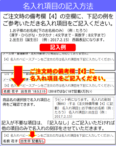 【名入れ項目について】 1.お子様のお名前(下のお名前のみ)(例:たろう) (漢字・ひらがな・カタカナ:4文字まで・英数字:8文字まで) ※お名前のみになります(名字は入りません) 2.出生日(誕生日)(例 : '18.2.15) ※西暦の表記が「2018」ですとスプーンに入りきらないため、「'18」の 表記になります。